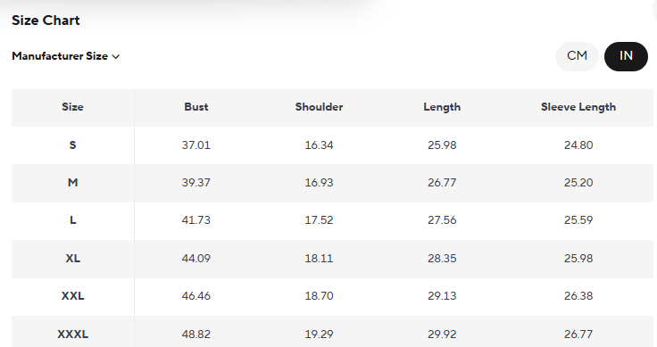 Sizing: Please refer to our detailed size chart to find your perfect fit. Measurements include bust, shoulder width, length, and sleeve length in both inches and centimeters.